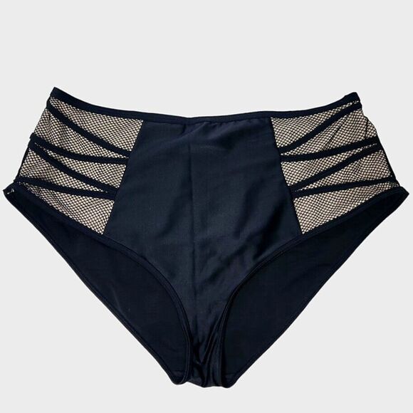 This bikini bottom is high waisted US Size 18. The tags have been removed, but it was not worn. It is in perfect condition with no flaws. The sides have a nice nude color with a strappy overlay. Great piece for the beach, a cruise, or the pool. It is versatile and will go with top.