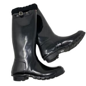 Hunter Original Black Rain Snow Water High Gloss Boots w/ Socks 8M In Amazing Condition. Does come with the Hunter Boot Socks. Shaft Height 16" Boot circumference 16" Low Heel .5" Bin Closet 4021