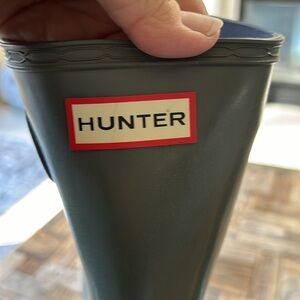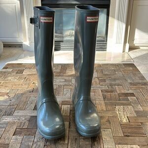 Hunter Original Tall Gloss Gray Rain Boots. Comes with a pair of white Hunter boot fleece/knit inserts/liners for warmth! Boots are in very good condition with a few marks/heel wear(see all photos) Size 8(boots), Size Large(liner)