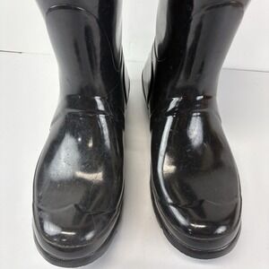 Description: Hunter Original Short women's size 9 rain boots in black featuring iconic high gloss finish and handcrafted natural rubber construction. Each boot is vulcanized for superior waterproof protection with Hunter's signature tread pattern and 100% recycled polyester lining. Shorter version of the classic Hunter tall boot offers 100% waterproof performance for wet-weather conditions. Original retail $165.