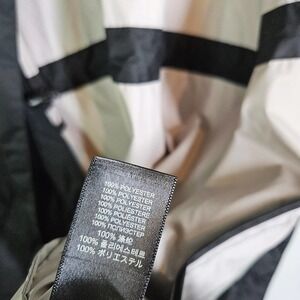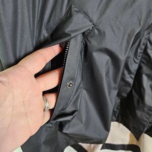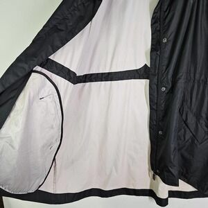 Key features: black jacket, lightweight, water resistant, zip and snap closure, hood, flap and snap pockets, unline, optional drawstring cinch waist, snap at the cuff