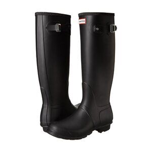 Hunter | These iconic black waterproof boots feature a seamless latex-dipped shell, woven nylon lining, and a sleek, structured silhouette. The orthopedic last and cushioned footbed provide all-day comfort, while the traditional calendered outsole ensures reliable traction. A decorative buckle adds a classic touch. In excellent condition. Some of the inside woven nylon lining coming loose at the top of the boot. Could easily be reattached. See photos. Rehoming because I am now a wide calf girly and these no longer fit.