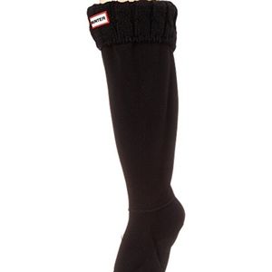 Hunter Original Tall Gloss black rain boots and matching Original Six-Stitch Cable knit/fleece boot socks. Both are VGUC, no scuffs or flaws that I can find aside from normal wear. Boots worn 5-10 times, socks worn 3-4 times.