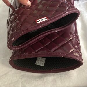 Embrace the elements with these stylish Hunter winter and rain boots, featuring a striking purple hue and a quilted diamond pattern. Crafted from glossy, waterproof material, these boots offer both functionality and flair. The mid-calf height and side buckle detail add a touch of elegance to your rainy day ensemble.