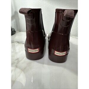 The Hunter Rain Boots in women's size 7 are a stylish and practical choice for wet weather seasons like winter, fall, and spring. These maroon burgundy short boots feature a round toe, pull-on closure, and a low block heel for comfort. Made with waterproof latex fabric and a rubber outsole, these ankle boots are designed for outdoor use. The Hunter brand is known for its quality and durability, making these rain boots a reliable option for keeping your feet dry in style. Please look closely at all photos and message me with questions.