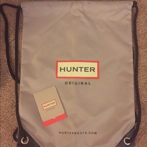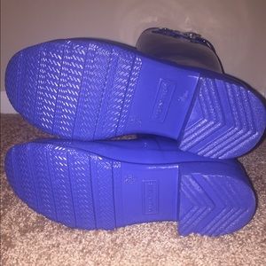 Tall gloss Hunter rain boot in bright cobalt. NEVER WORN! US Size 7. Comes in original box and with Hunter draw string bag.