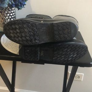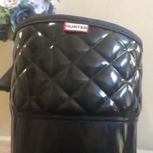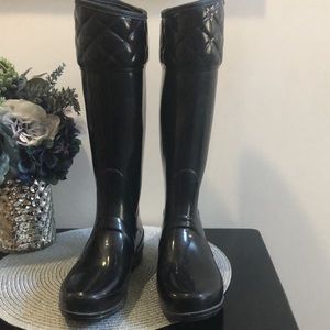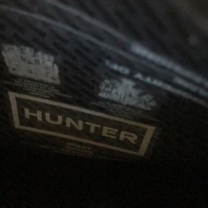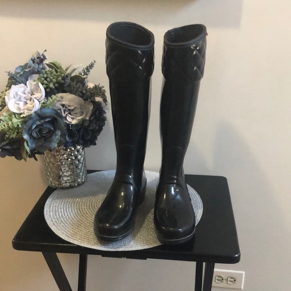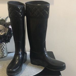 Hunter Rugley black Tall Rain Boot. Black textile rubber/nylon lining waterproof rain boot with an embossed logo. Approximate heel height is 1 inches. Boot shaft height 14 1/2 inches. Excellent preowned condition. Size 7M/8F. EU 39 UK6