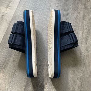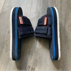 Comfortable Hunter flatform {flat platform} sandals in navy with red, white and blue accents. Comfortable adjustable straps. Unisex. Note: I typically wear a women’s US 8.5 shoe: please see photos for how the UK 8 fits my feet. Excellent condition.