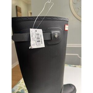 The Hunter Tall Black Rain Mud Boots in Women's size 10 are a stylish and functional choice for travel, casual wear, or workwear. These knee-high boots feature a solid black color with a round toe and low block heel for comfort and stability. Made with waterproof rubber outsole and upper material, these boots are perfect for rainy or snowy weather in winter, fall, or spring. The pull-on closure and buckle feature add convenience and practicality to this versatile rain boot from the trusted brand Hunter.