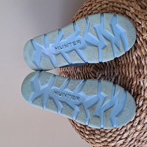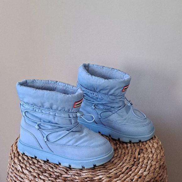 Trending outdoor brand Hunter youth unisex light blue waterproof/insulated pull-on ankle booties with elastic ankle strap laces, thick padded interior and thick rubber soles. Pre-owned and in gently used condition. Marks to nylon and soles. Please see pictures. Label is missing.