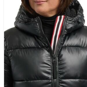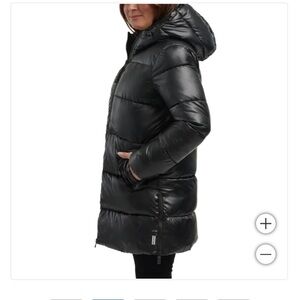 Warm and stylish black puffer coat. Features a cozy hood. Ideal for cold weather.