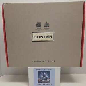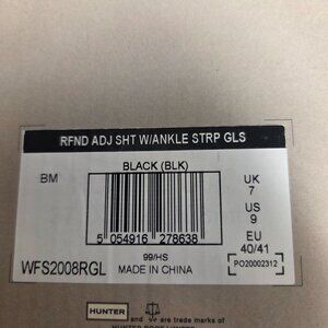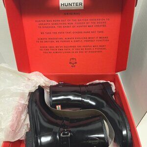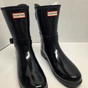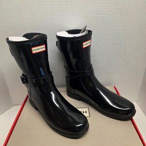 BARELY WORN, Hunter Women's short, glossy black, size 9 (US), Wellington Refined Rainboot with adjustable strap. The boots are still in the original box and were worn once for a short period of time. See Photos for the exact condition of the item, including the soles.