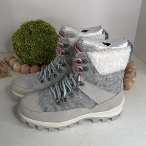 These cosy felt boots offer both style and warmth, with a felt upper, lace-up front and contrast ankle lace closure. Lined with plush boucle fabric, they'll keep your feet toasty in bitter temperatures, while the 32mm heel, pull tab and rubberised logo stand out on grey days. Conquer uneven terrain effortlessly thanks to the lug rubber sole - a thick rubber with deep grooves which improve stability on rough ground. Available in several colours to suit your style. · Felt upper · Insulated boucle fabric lining · Sole: Lug rubber · Heel pull tab · Rubberised logo at tongue · Heel size: 32mm approx. · Colour: Frosted Grey. Size 7