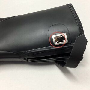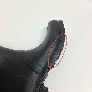 The Hunter Tall Original Back Adjustable Gloss Boots are NEW, but have manufacture defects such as small dent holes on the side of the sole and a stain mark on the buckle.