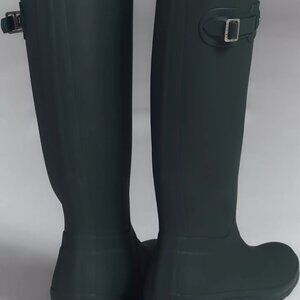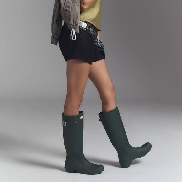 Classic Hunter Original Tall Rain Boots in a deep forest/dark green color. Waterproof natural rubber construction with adjustable side buckle, non-slip tread, and iconic Hunter logo patch. Timeless, functional, and perfect for rain, snow, festivals, or everyday wear.