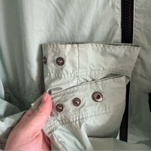 Lightweight and easy to fold up and take anywhere. A beautiful minty green color. Just a little discoloration on the cuffs and photo shown. Size large.