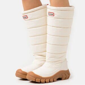 NIB Hunter Intrepid Tall Women's Snow Boots in Cream/White. Brand new with tags and original box. Extreme cold weather calls for the Intrepid Snow Boot. Handcrafted with a recycled nylon upper, recycled fleece lining and an innovative Ortholite footbed, tread through frosty excursions with the comfort and support you can rely on. The water resistant shell and internal waterproof membrane ensure these boots are 100% waterproof and the elasticated drawstring and toggle along the topline retain warmth.