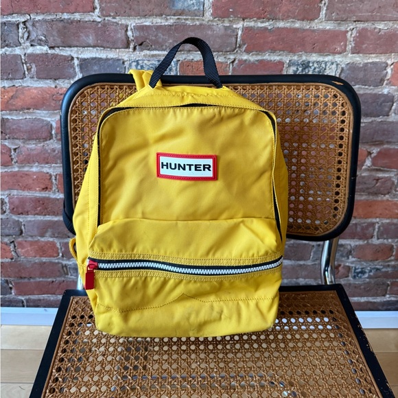 Bold yellow Hunter backpack. Ideal for daily adventures. Features a front zip pocket and sturdy straps. Smaller in size than traditional backpack. Great for travel or hikes.