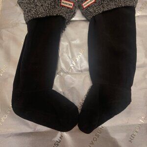 Step into comfort and style with the Hunter brand boot socks in size large. Designed to enhance fit while giving added comfort and warmth, these socks are crafted with a soft polyfleece, perfect for wearing with your favorite boots. The black socks are accented with a beautifully knitted gray cuff featuring the iconic Hunter logo proudly displayed on the front. The material is not only cozy but also provides excellent insulation to keep your feet toasty on cold days. Their large size ensures they are a comfortable fit for a range of foot sizes, and the versatile color scheme makes them an ideal companion to any boot color. Elevate your boot-wearing experience with these stylish and functional boot socks.