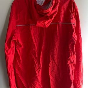 Lightweight water resistant rain jacket, size small. Snap pockets in front, and supper closure on jacket. No stain or rips.