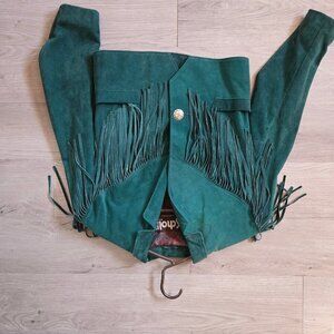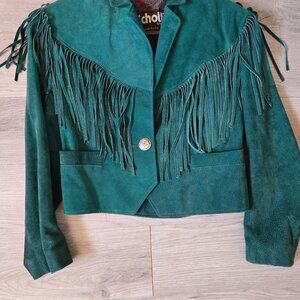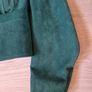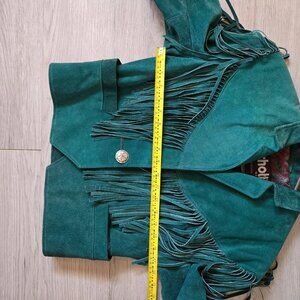 Hunter green suede jacket with fringe. Two small pockets on front. One button closure. Silky paisley print inside. Purchased new and wore it once with my green western boots. This is a darker green than pictured. Pic 3 shows some suede variations. This is not pilling or damage to the material. Measurements in pics. Great condition. No rips, stains, or tears. From a smoke free and pet free home.