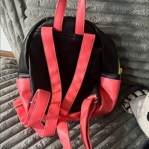 Mini backpack with anime character design. Features black and red design. Heart and diamond accents.
