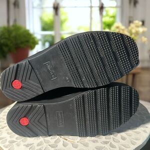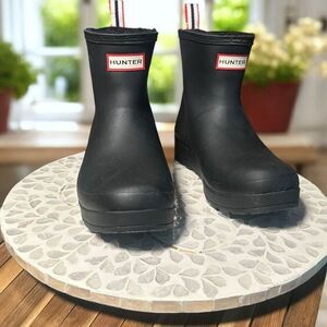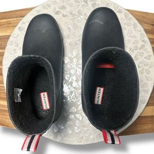 hunter play short, hunter insulated, faux shearling rain boots, waterproof ankle boots, black rubber boots, women’s size 9, uk 7, platform rain boots, vegan shearling, pull on boots