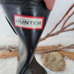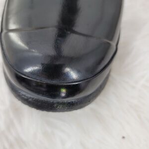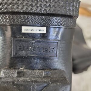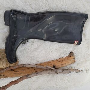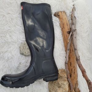 Black tall hunter boots classic. missing one rivet which is cosmetic. a couple of dings as at heel as shown in pictures. Preloved condition. All sections of interest as well any known flaws have been documented in the photos and noted as thoroughly as possible. if there are no known flaws, none will be noted. Please feel free to ask any questions before purchase 🙂.