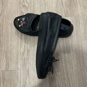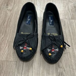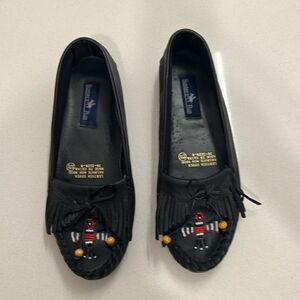 Moccasins with leather uppers. Indigenous / Native beading and design. Fringe with bow. Cushioned insoles. Sizing on shoe is label as a 10W