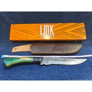 The Hunting Bowie Knife by LMK Knives is a custom forged Damascus blade with a 11.75 inch drop point design, perfect for hunting and outdoor activities. The ambidextrous design and full tang construction ensure durability and control, while the sharp edge makes for precise cutting. Handmade in the United States, this original piece includes a sheath for easy carry and storage. With a sleek gray blade and wooden handle, this modern fixed blade knife is a must-have for collectors and outdoor enthusiasts alike.