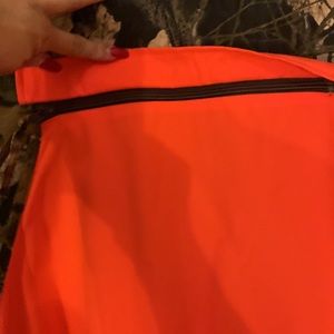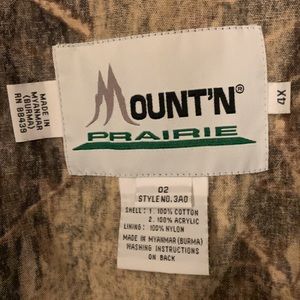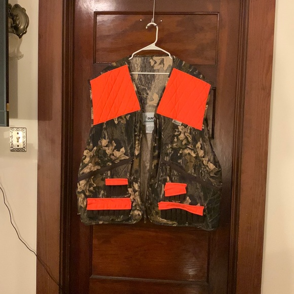 MOUNT’N PRAIRIE CAMOUFLAGE hunting vest jacket. Trim in orange on front and back can hold up to 24 shot gauge bullet’s. Big Zipper pocket on front of vest. Giant pocket on back of vest that zips and unzips. Also has a inside pocket. Size 4XL