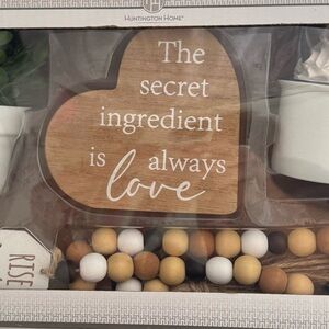 Charming kitchen set by Huntington Home. Features a wooden heart sign with 'The secret ingredient is always love.' Includes a white planter with green artificial plant and a white mug along with rise and grind decor beads. Perfect for adding warmth to your kitchen. Great for tier trays as well