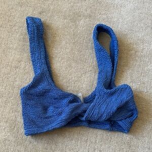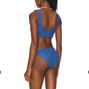 The Hunza G Juno Bikini Set features a textured fabric, pull-on styling, and twist detail at the bust. The cups are unpadded. The item is sold as a set. It is composed of 97% polyamide and 3% elastane. The bikini was made in Morocco. This set includes a bikini top and a bikini bottom.