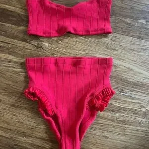 Dive into style with the Hunza G Red Bikini Set, featuring a chic ribbed texture and minimalist design. The bandeau top and matching bottoms offer a sleek and modern look, perfect for making a statement at the beach or poolside. Crafted with stretchy material, this set ensures comfort and a flattering fit.
