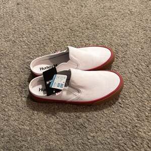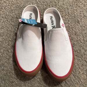 New Hurley white slip-on canvas shoes feature a distinctive red trim around the sole and a classic gum rubber sole. These comfortable and stylish shoes are perfect for casual wear. Brand new with tags, offering immediate comfort and a versatile look. Tags indicate 'BLOOM MADE WITH CARE'.
