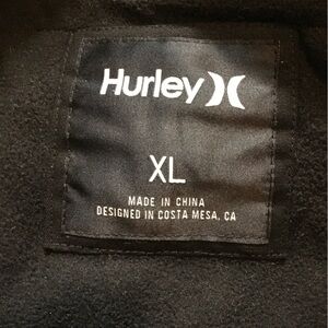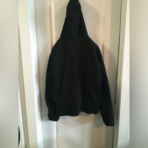 New- Never Worn! This Sleek black jean type canvas jacket by Hurley features a zip-up front and side hand pockets, left side zip chest pocket, attached hood, inner fleece lining and addition inner stretch cuff for extra warmth!