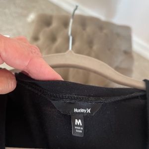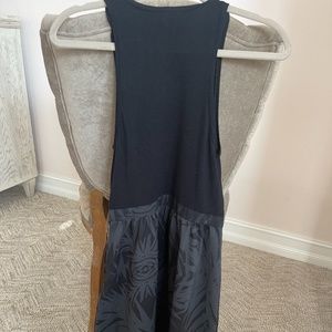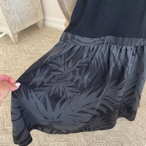 Chic backless design. Black top with gray patterned skirt. Ideal for casual wear.