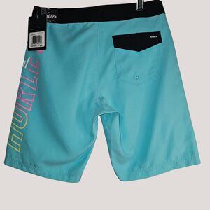 These Hurley boardshorts are designed for young boys who enjoy water activities. With a stylish Aurora green color and a comfortable fit, these shorts feature a convenient back pocket and secure drawstring closure, providing both functionality and style for active beach days.