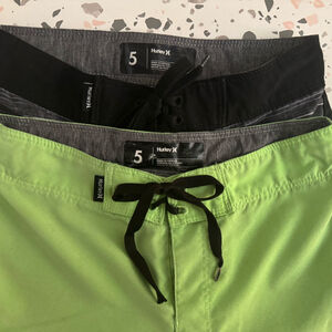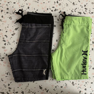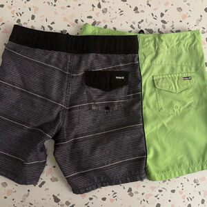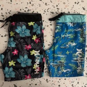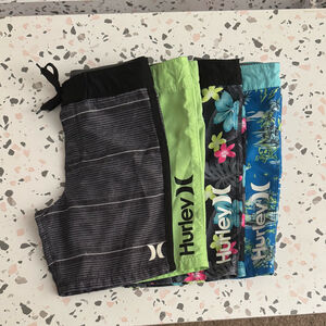 4 Hurley swim shorts for boys in good used condition. Black and Green are a size 5. Blue and Flowers are a size 6. All have been loved and show some wear.