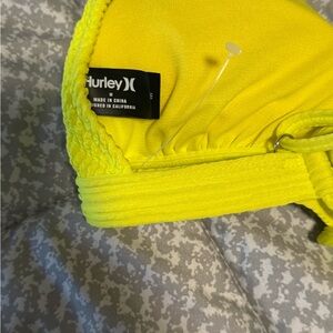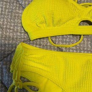 Bright yellow bikini set with textured fabric. Features adjustable straps and side ties.