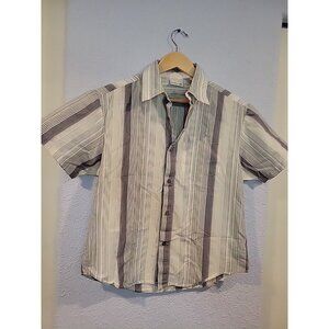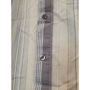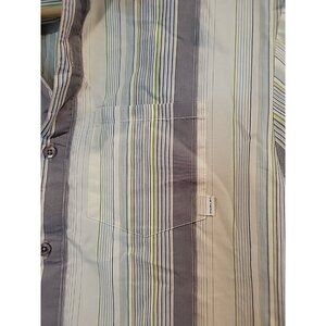 Mens Hurley button down short sleeve shirt in a neutral striped pattern of ivory, grey and green. Has a front pocket with the Hurley logo tab. Excellent condition, no flaws. Measures 21" pit to pit and 26" long.