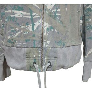 Other: fleece inside sweatshirt material outside, embroidered skull & crossbones on back, spellout letters that are stitched on with raw edges on front, drawstring hood, hood lined with fabric shown in last photo, full zip front, two front pockets, ribbed bottom and sleeve cuffs