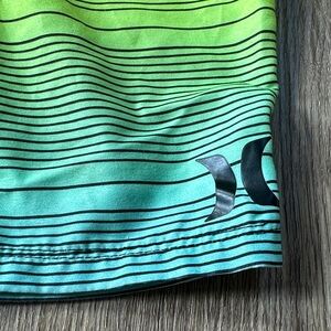 Vibrant swim trunks with a colorful gradient. Features drawstring waist. Perfect for beach fun. The tag on the inside was worn and it looks like it stuck to the inside of the shorts. Not noticeable from outside.