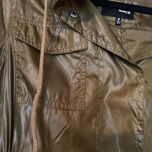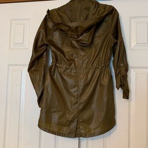 Olivey green lightweight jacket. Detachable hood zips off, 4 pockets on front - button and zip closure, cinch waist, buttons on sleeve to roll them up. Great little jacket! In great condition. Does get easily wrinkled but good for an extra layer!