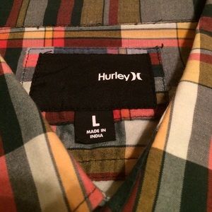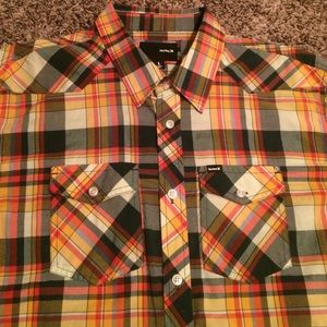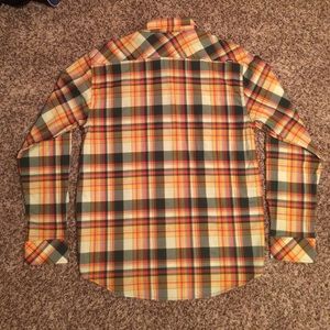 This button down is forest green with white, orange, yellow and red strips. Worn a few times but looks brand new.