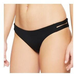 • Bikini bottom with side strap detail. Clean finish seams. Clear silicon grip print at interior back leg opening.