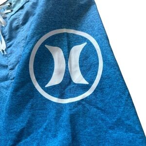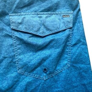 Keywords: Hurley, board shorts, men's swimwear, blue gradient, quick-drying, drawstring closure, size 32, recreational, beachwear, summer fashion, pre-owned.