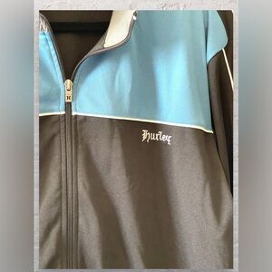This authentic Hurley Co. track jacket is the perfect addition to any wardrobe. Made of 100% polyester, this jacket features a full zip design and comes in a stylish black & teal blue accent color. The jacket is available in size Large and is perfect for men who want to add a touch of style to their outfit. The jacket has a solid pattern and is made in China. It is ideal for casual wear and is perfect for any occasion.
