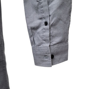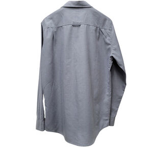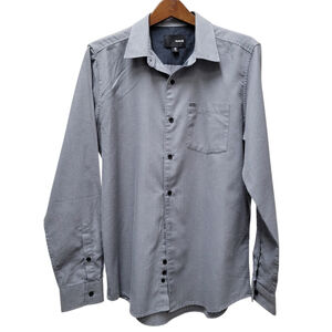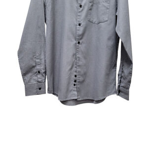This is a Hurley men's long-sleeve shirt in size medium. It features a collared neckline, solid gray color, made of polyester and cotton blend. The shirt has a regular fit with long sleeves and pockets. It is lightweight, easy care, suitable for all seasons, and is not vintage. The shirt is suitable for winter, fall, and spring, and was manufactured in China.