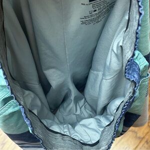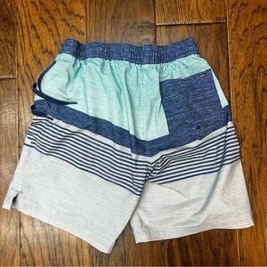 Stylish swim trunks with a drawstring waist. Features blue and gray stripes. Comfortable and lightweight. T2-14